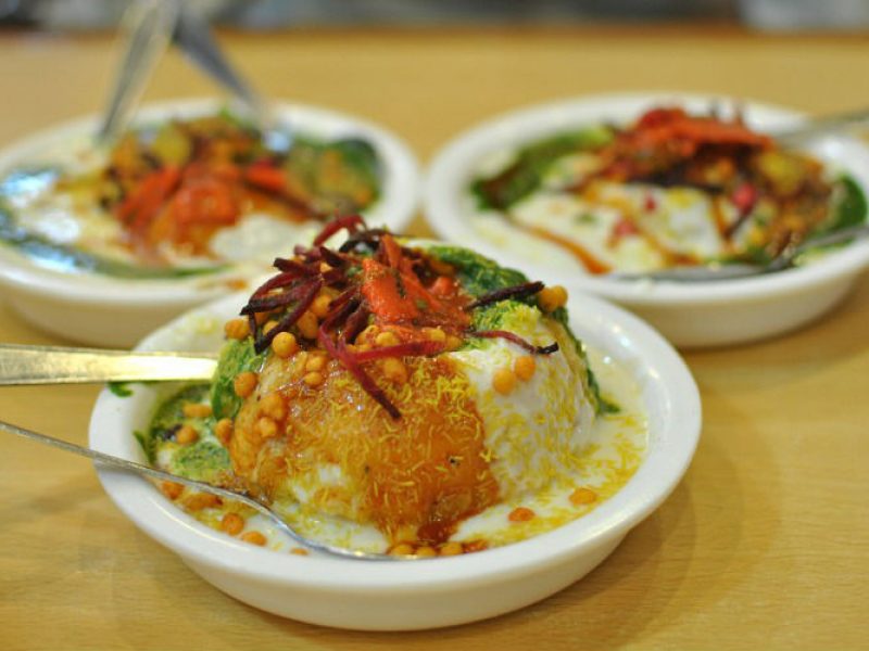 - Light crispy kachori(deep fried bread) is topped with chickpea and chutney that provides a tangy,juicy and spicy taste to your tongue.